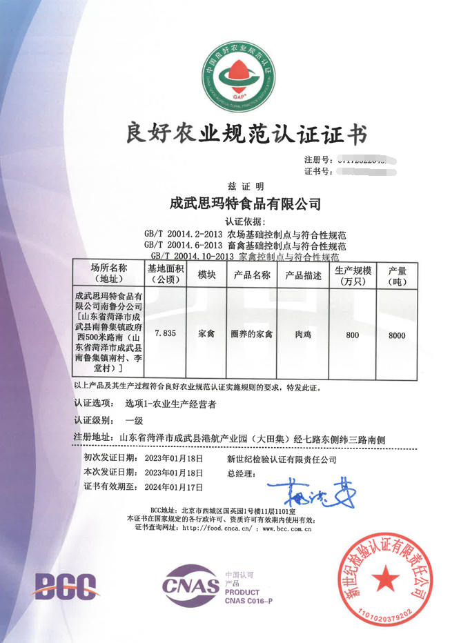 為推動(dòng)產(chǎn)業(yè)品種升級、飼養(yǎng)升級、屠宰升級和品牌升級,成武思瑪特食品有限公司(以下簡稱:成武思瑪特)兩個(gè)養(yǎng)殖基地雙雙順利通過了BCC實(shí)施的良好農(nóng)業(yè)規(guī)范(GAP)檢查工作,并獲得中國GAP+家禽模塊(肉禽)一級認(rèn)證證書(最高級別)。