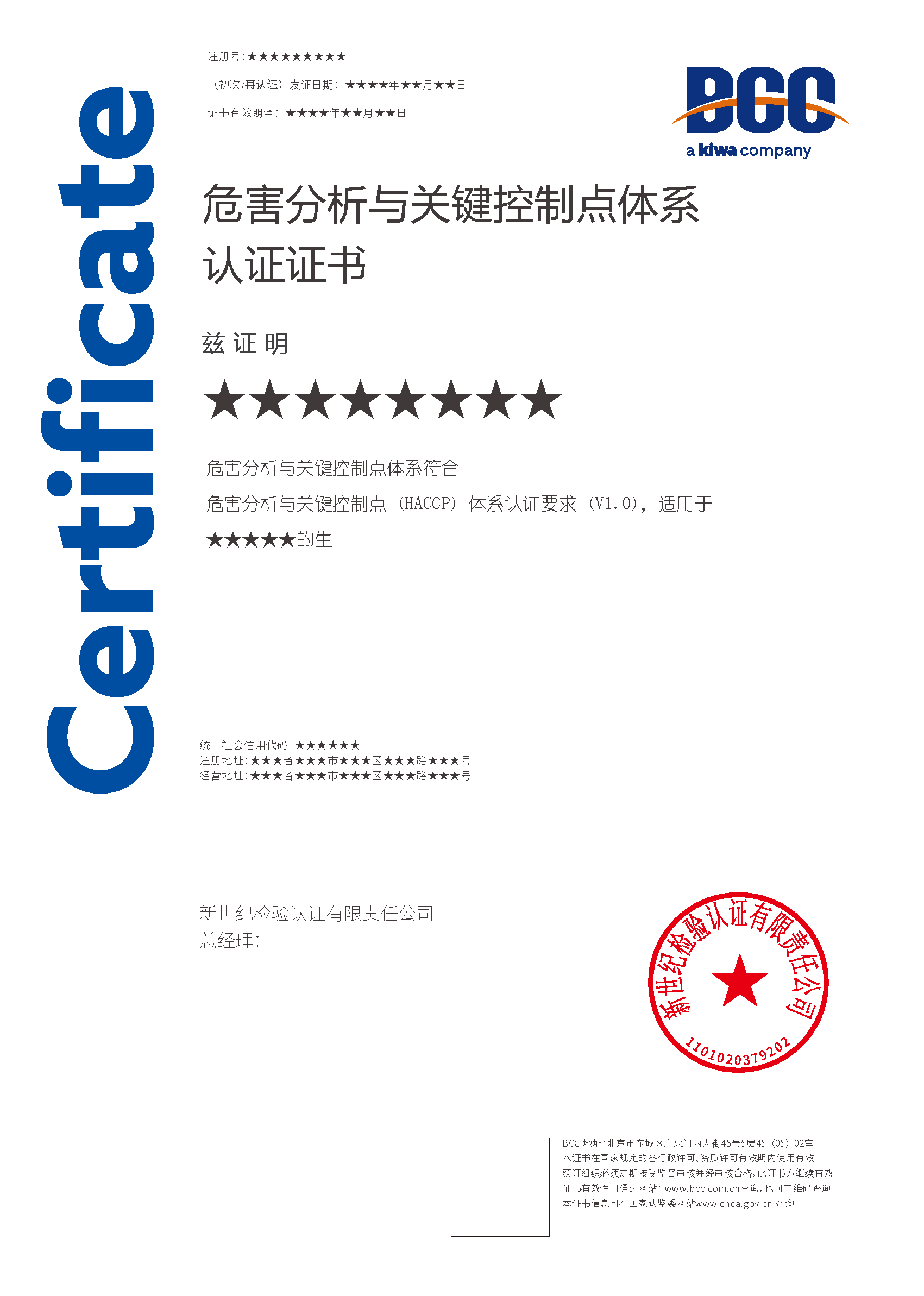 HACCP體系認證證書(CNAS) HACCP體系認證證書