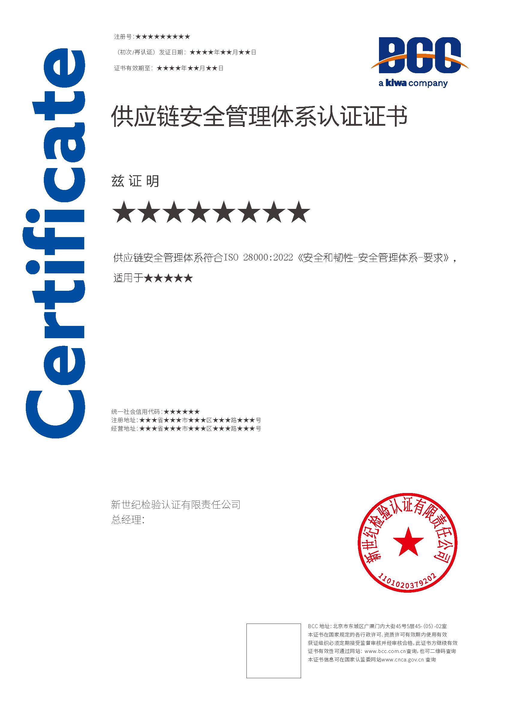 本頁涉及的認證服務中均有對應的《認證實施規(guī)則》,BCC擁有其最終解釋權(quán)。任何組織及個人未經(jīng)BCC許可,不得以任何形式全部或部分使用(法律要求除外)認證相關(guān)信息。如需獲取相關(guān)實施規(guī)則請用以下方式聯(lián)系獲?。弘娫挘?10-58579316 郵箱:fwjs@kiwa.cn