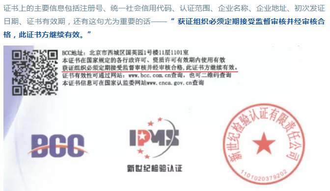 證書上的主要信息包括注冊(cè)號(hào)、統(tǒng)一社會(huì)信用代碼、認(rèn)證范圍、企業(yè)名稱、企業(yè)地址、初次發(fā)證日期、證書有效期,還有這句尤為重要的話——“ 獲證組織必須定期接受監(jiān)督審核并經(jīng)審核合格,此證書方繼續(xù)有效。”