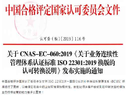 2019年12月31日,中國合格評定國家認可委員會(CNAS)發(fā)布了關于CNAS-EC-060:2019《關于業(yè)務連續(xù)性管理體系認證標準ISO22301:2019換版的認可轉換說明》發(fā)布實施的通知。