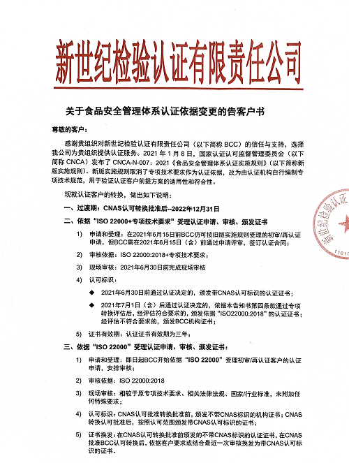 關(guān)于食品安全管理體系認(rèn)證依據(jù)變更的告客戶書