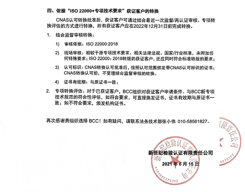 2021年7月1日(含)后通過認(rèn)證決定的,依據(jù)本告知書第四條款通過專項(xiàng)轉(zhuǎn)換評估后,經(jīng)評估符合要求的,頒發(fā)依據(jù)“ISO22000:2018”的認(rèn)證證書;經(jīng)評估不符合要求的,頒發(fā)BCC機(jī)構(gòu)證書;