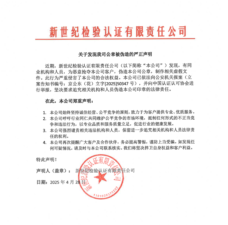 近期,新世紀檢驗認證有限責任公司(以下簡稱 “本公司 ” )發(fā)現,有同業(yè)機構和人員,為惡意搶奪本公司客戶,偽造本公司公章,制作相關虛假文件。此行為嚴重侵害了本公司的合法權益。本公司已依法向公安機關報案(立案告知書編號: 京公東(花)立字[2025]50347號),并向中國認證認可協(xié)會進行舉報,堅決要求追究相關機構和人員偽造本公司印章的法律責任。