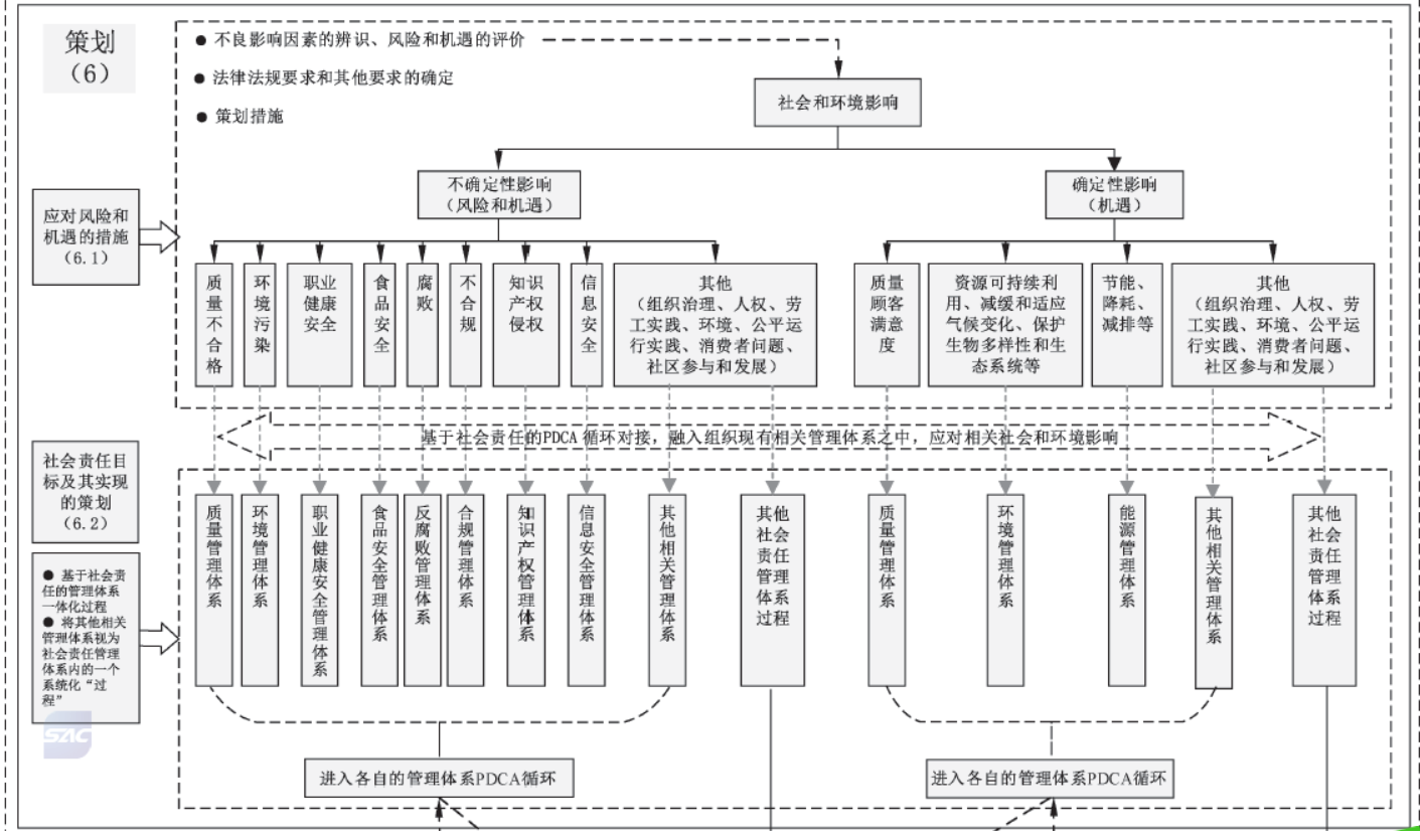使組織能夠以社會責任為抓手,從頂層治理(價值觀、使命、精神和發(fā)展戰(zhàn)略等)視野出發(fā),統(tǒng)領、規(guī)范、協(xié)調(diào)和融合組織內(nèi)其他相關管理體系(如質(zhì)量管理體系、 環(huán)境管理體系、職業(yè)健康安全管理體系、食品安全管理體系、反腐敗管理體系、合規(guī)管理體系、知識產(chǎn)權(quán)管理體系、信息安全管理體系等),有效實現(xiàn)組織管理體系的一體化。